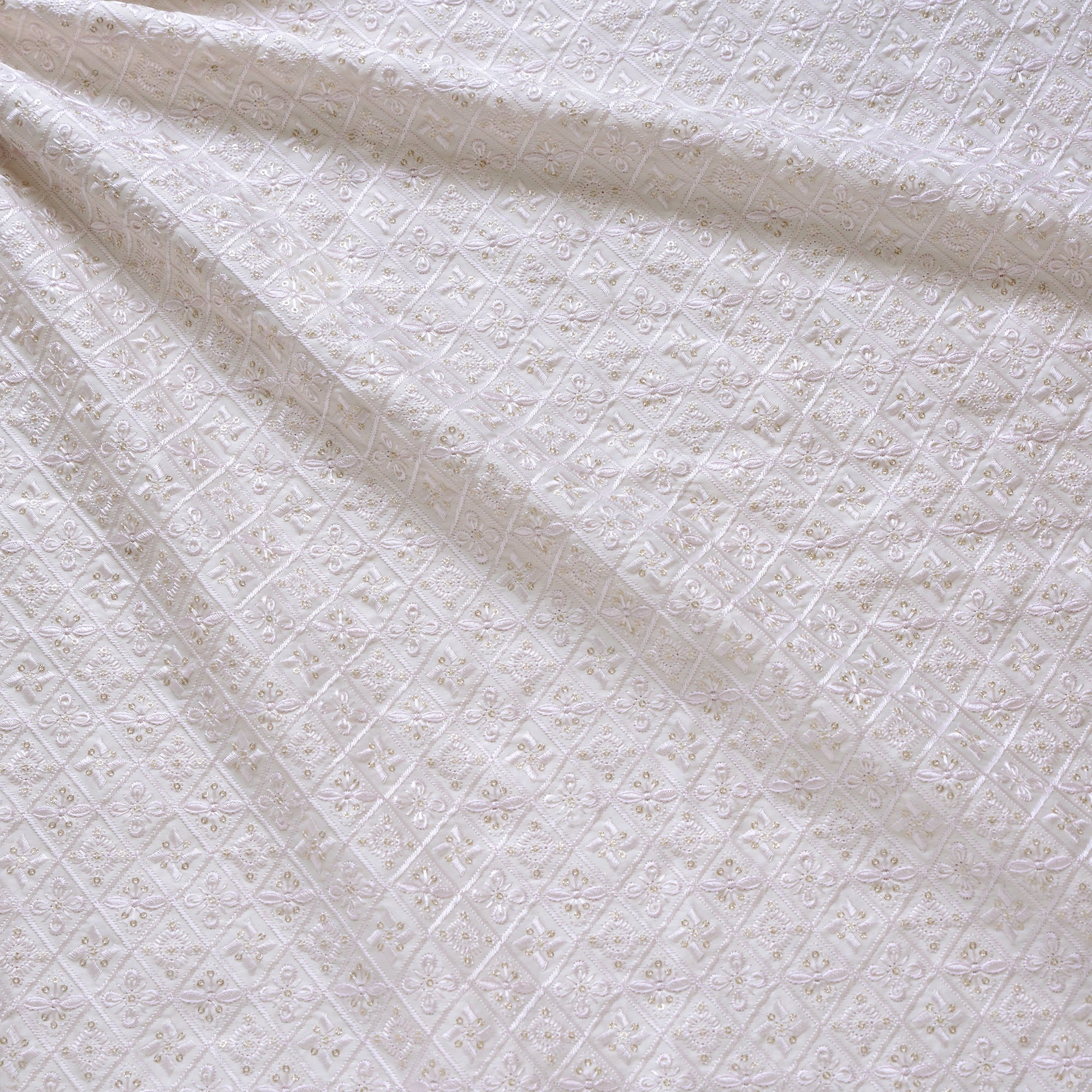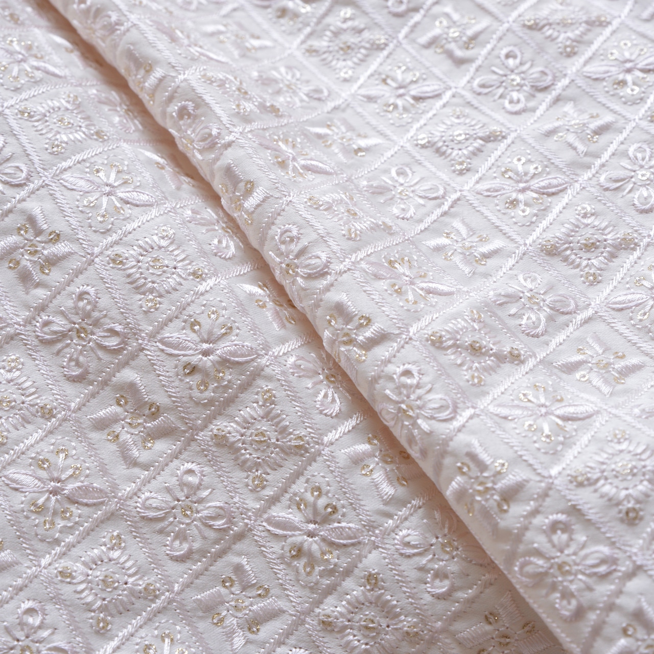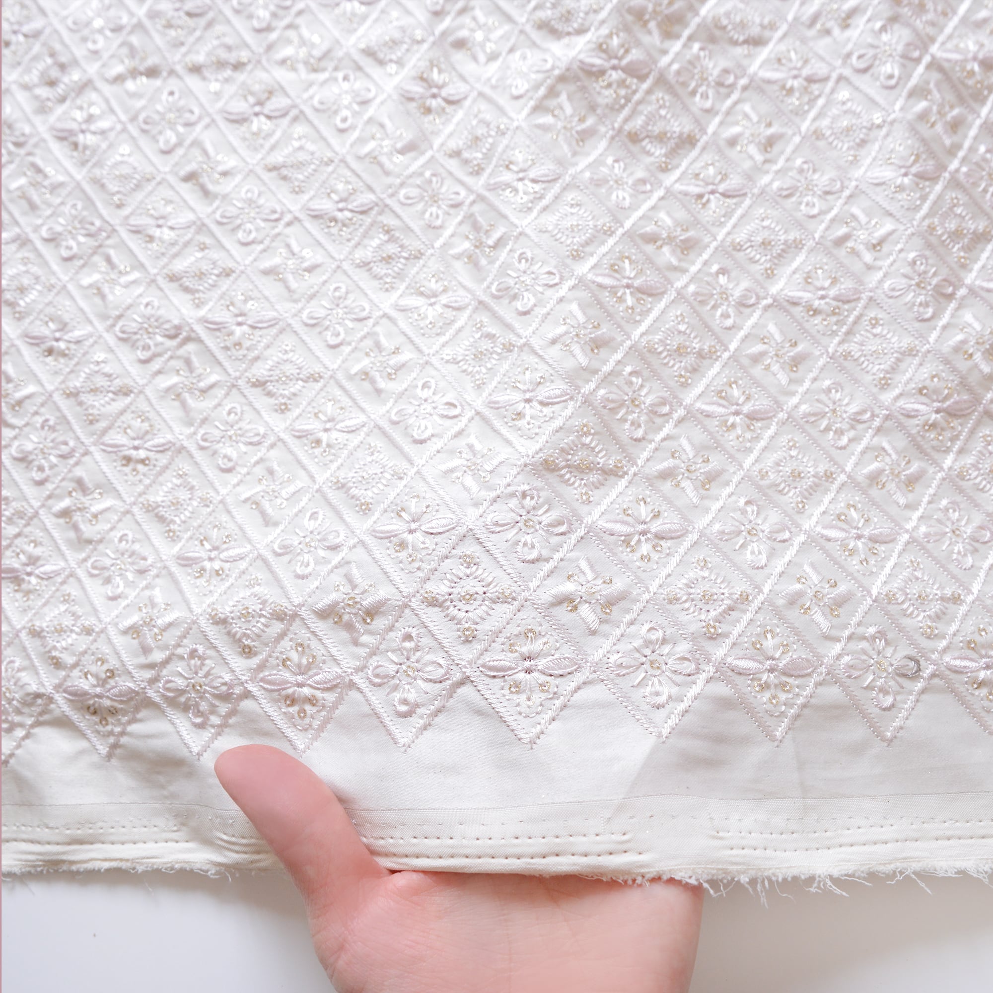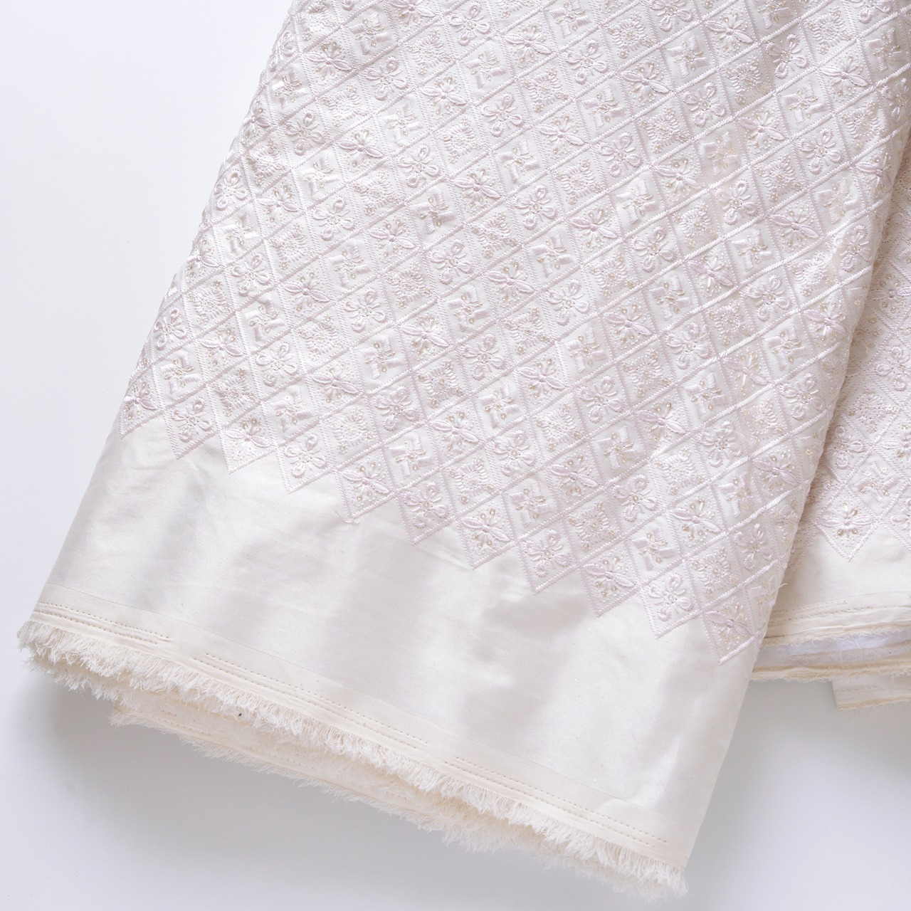 オフホワイト生地に薄いピンクホワイト刺繍が施された光沢感の美しいインド刺繍生地です
