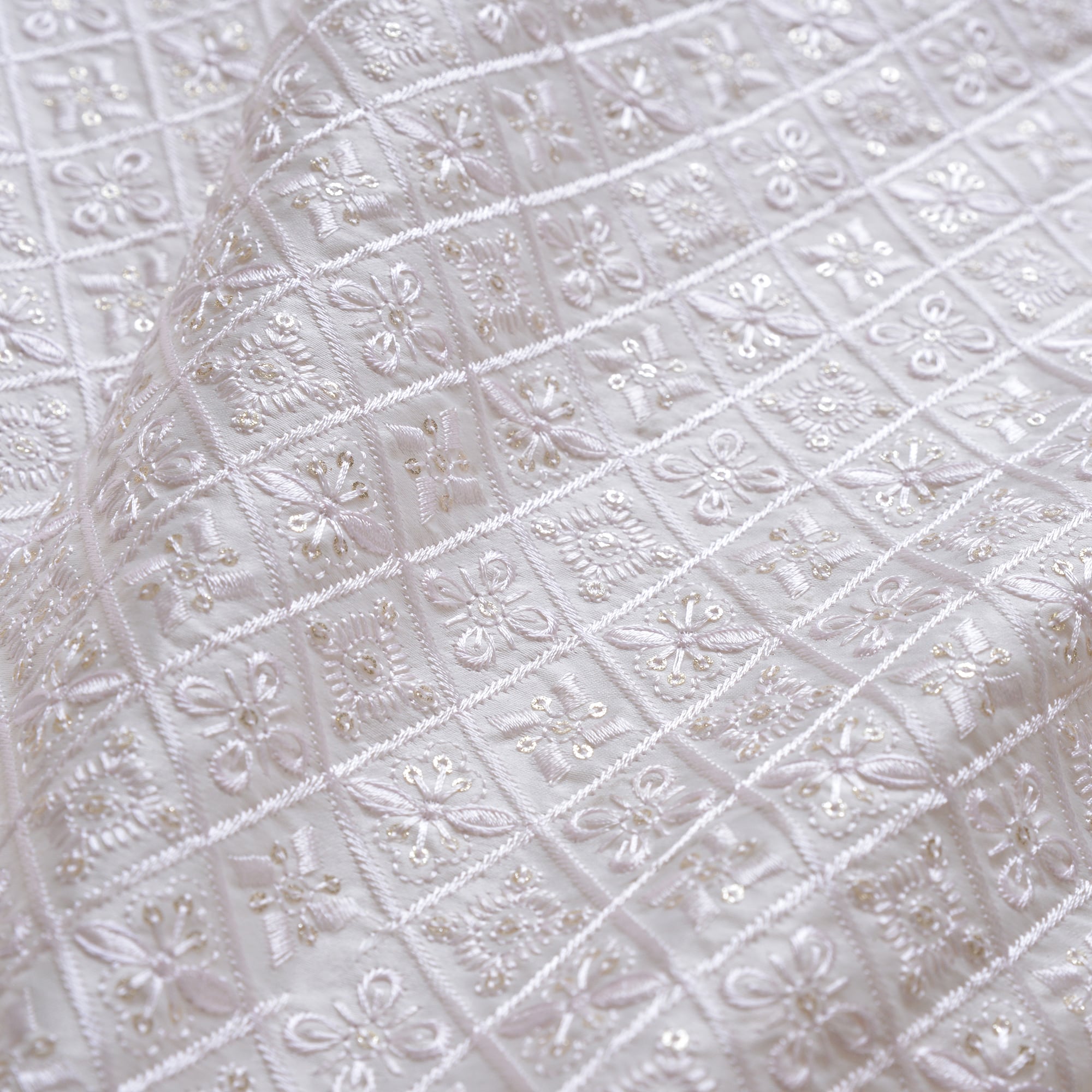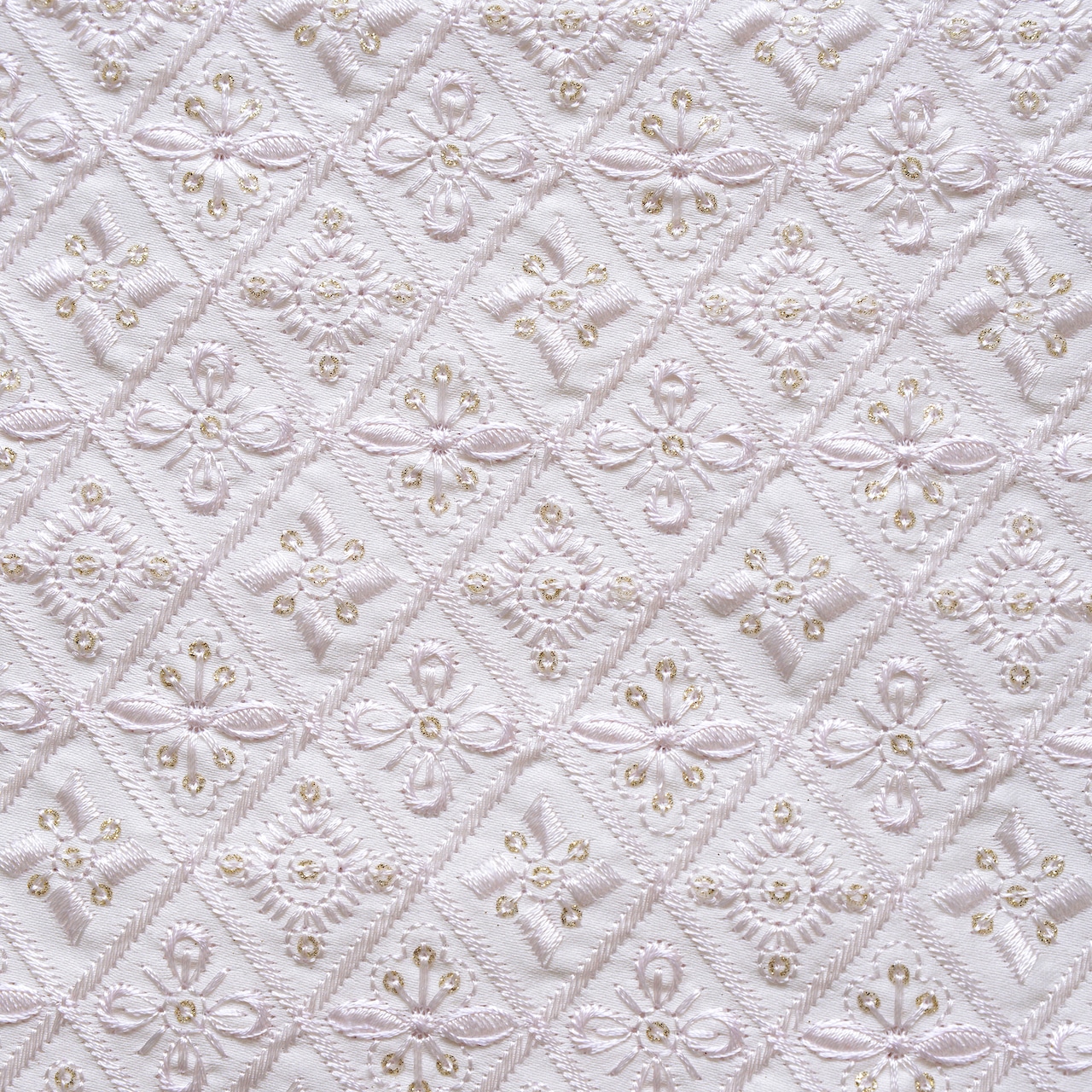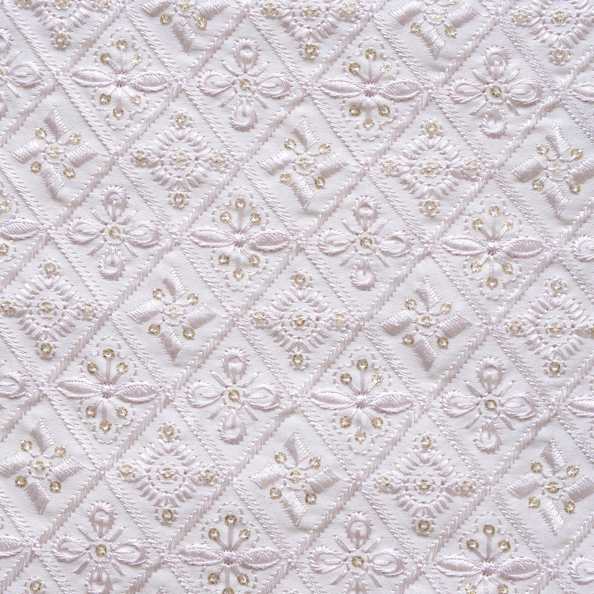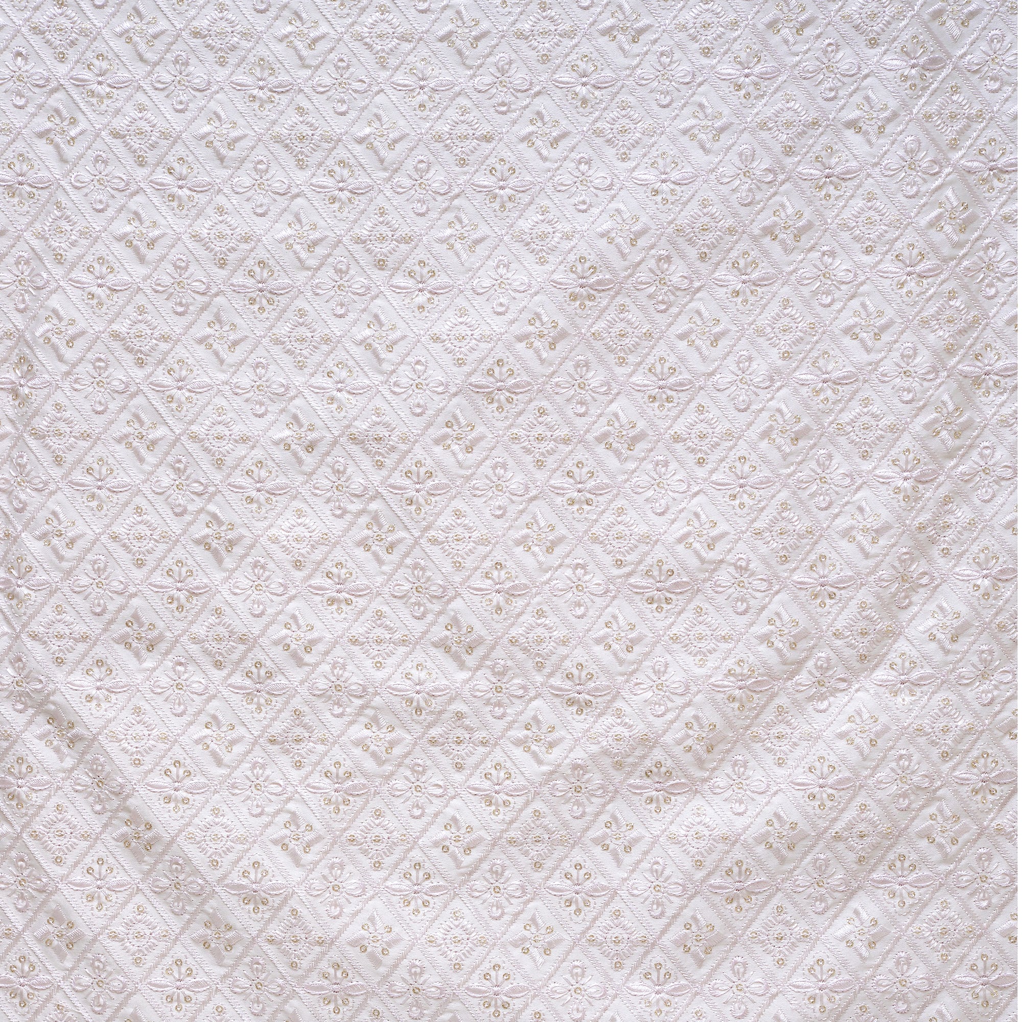 オフホワイト生地に薄いピンクホワイト刺繍が施された光沢感の美しいインド刺繍生地です