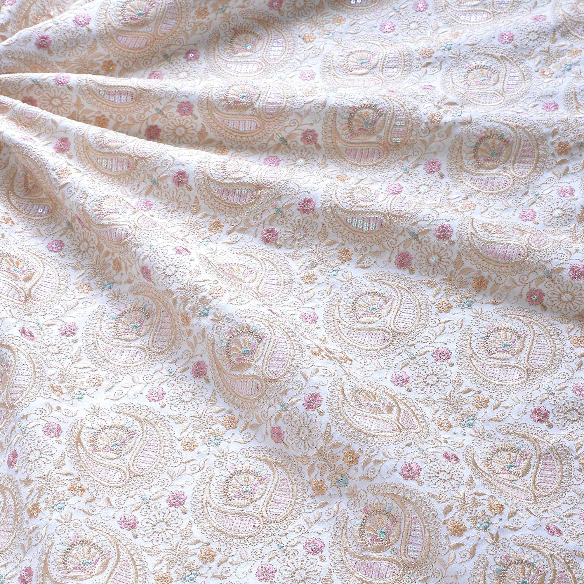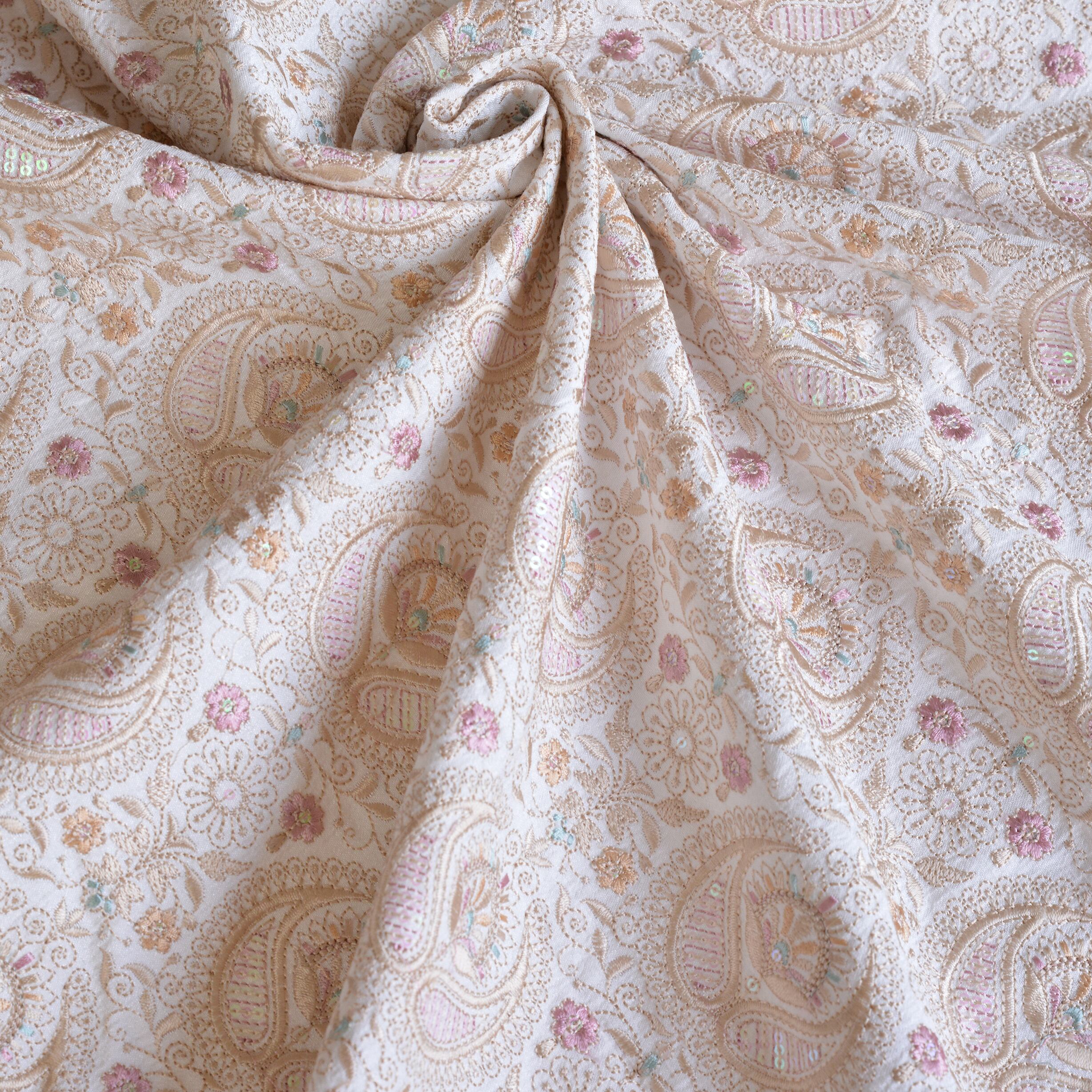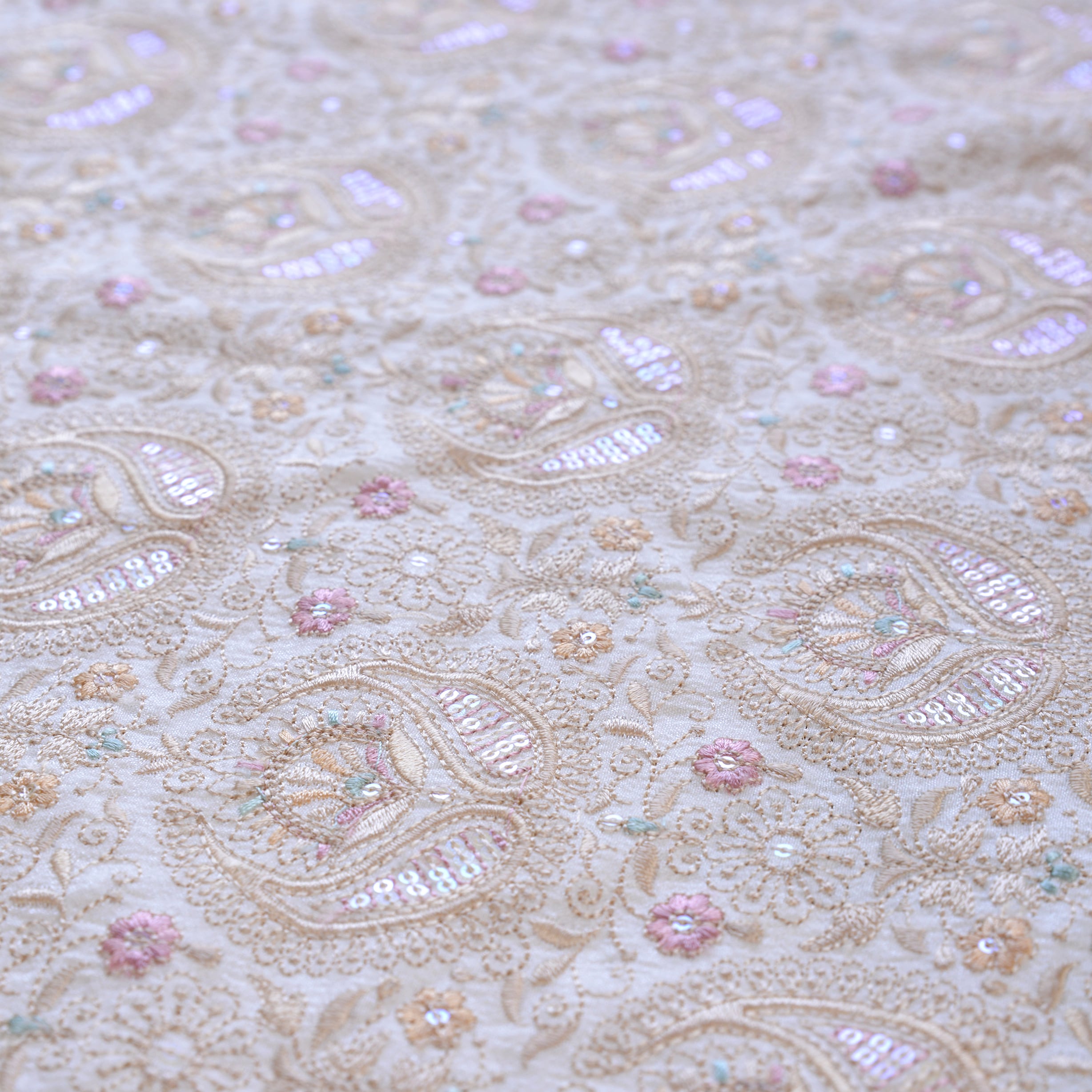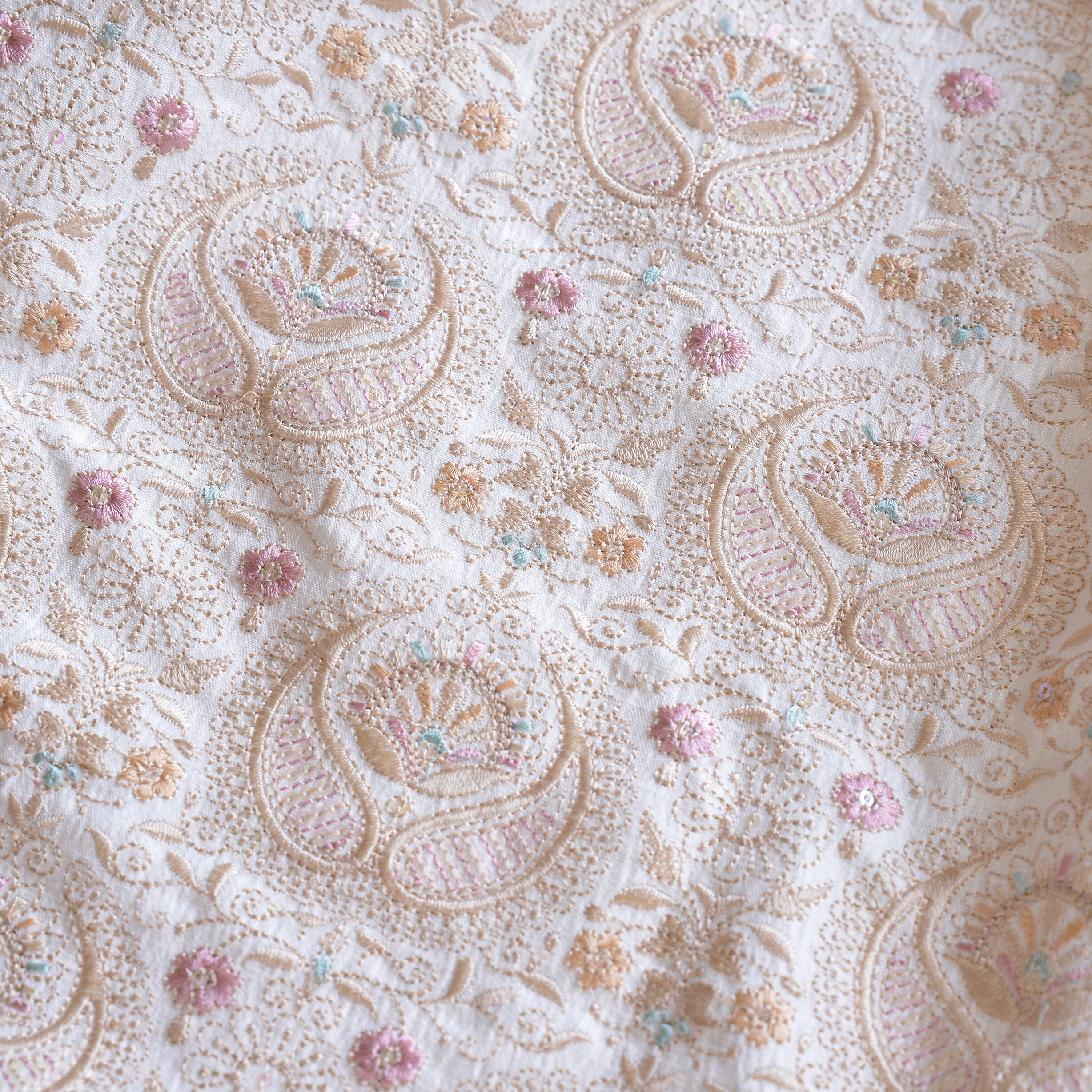 ホワイト生地にオーロラのスパンコールが美しい刺繍生地となっております
