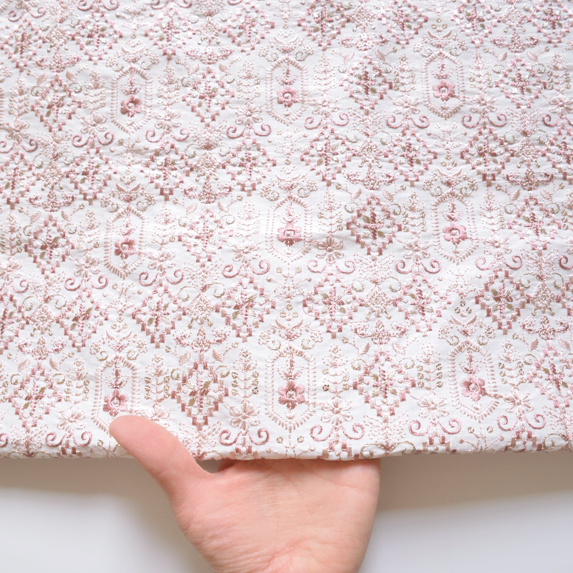 【再販】インド刺繍生地 光沢刺繍 コーラルピンク 23031